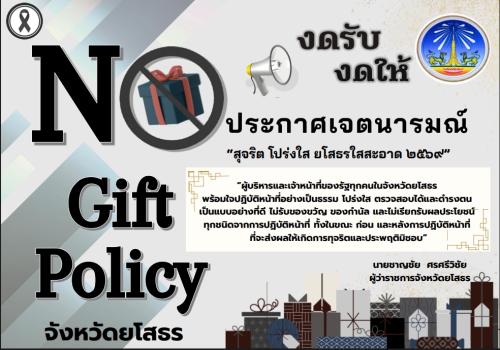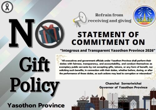 ประกอบกับ สำนักงานคณะกรรมการป้องกันและปราบปรามการทุจริตในภาครัฐ (สำนักงานป.ป.ท.)ได้แจ้งแนวทางการขับเคลื่อนนโยบาย No Gift Policy จากการปฏิบัติหน้าที่ จังหวัดยโสธรจึงได้ประกาศเจตนารมณ์ "สุจริต โปร่งใส ยโสธรใสสะอาด 2569" และ "งดรับ งดให้" ของขวัญ ของกำนันทุกชนิดจาการปฏิบัติหน้าที่ (No Gift Policy)