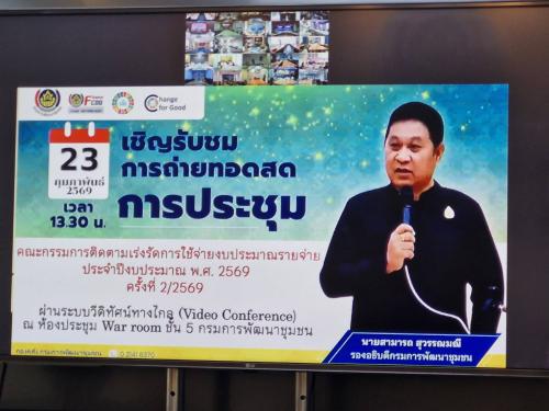 กรมการพัฒนาชุมชน จัดประชุมคณะกรรมการติดตามเร่งรัดการใช้จ่ายงบประมาณ ประจำปีงบประมาณ พ.ศ. 2569 ครั้งที่ 2/2569 ผ่านระบบวีดิทัศน์ทางไกล (Video Conference) จากห้องประชุม War room ชั้น 5 กรมการพัฒนาชุมชน โดยมีนายสามารถ สุวรรณมณี เป็นประธานการประชุม เพื่อติดตามผลการเบิกจ่าย และเร่งรัดการใช้จ่ายงบประมาณให้เป็นไปตามเป้าหมายอย่างมีประสิทธิภาพ