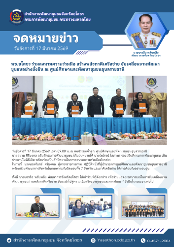 วันอังคารที่ 17 มีนาคม 2569 เวลา 09.00 น. ณ หอประชุมค้ำคูณ ศูนย์ศึกษาและพัฒนาชุมชนอุบลราชธานี สำนักงานพัฒนาชุมชนจังหวัดยโสธร เข้าร่วมพิธีลงนามข้อตกลงการแสวงหาภาคีเครือข่ายความร่วมมือด้านการพัฒนาชุมชน และร่วมเป็นสักขีพยานในการลงนามบันทึกข้อตกลงความร่วมมือ (MOU) เพื่อยกระดับการขับเคลื่อนงานพัฒนาชุมชนให้เกิดผลอย่างเป็นรูปธรรม